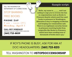 This 40-plus year old organization did not let this action stay quiet, and has been very active throughout the month of April in attempt to counteract this restrictive action. B2P started their first call to action with a phone zap directed at Washington Prisons Correctional Manager Roy Gonzalez, implemented to demand that this new memo “DOC 450.100” be rescinded at once. This group outcry was heard loud and clear, as Department of Corrections have since quelled their strong stance on the issue.